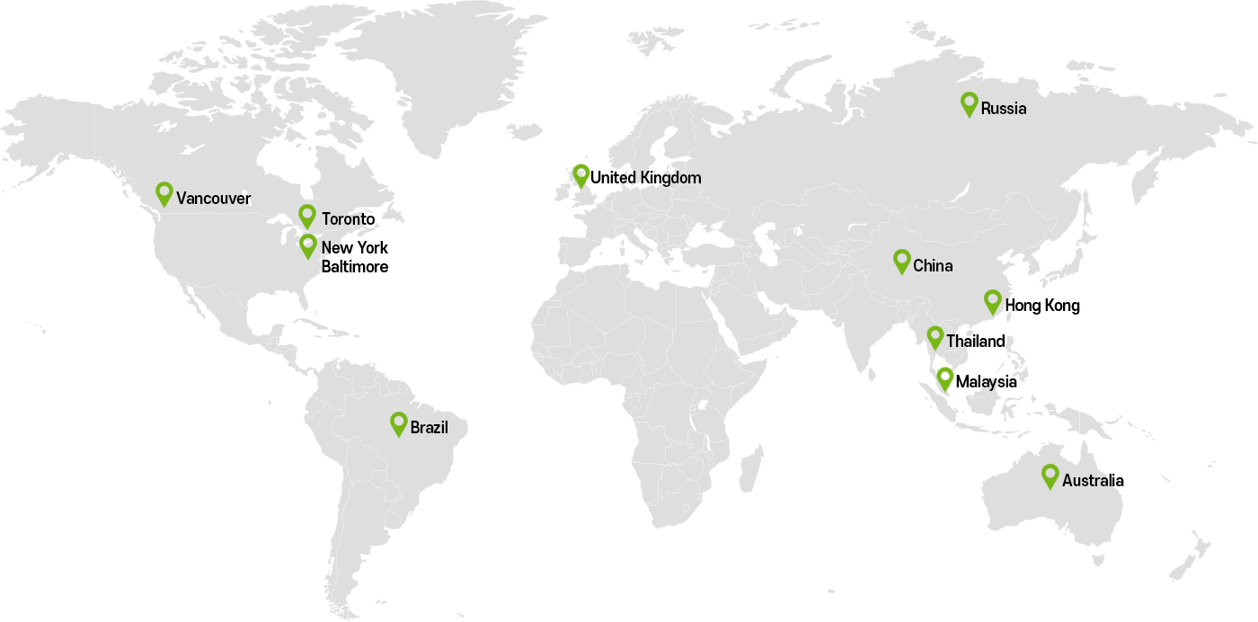 United States (New York, Baltimore) / Canada (Vancouver, Toronto) / United Kingdom / Australia / Brazil / China / Hong Kong / Thailand